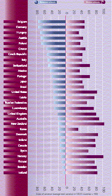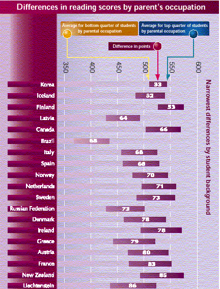 SUOMESSA OPPIMINEN KANSAINVÄLISESTI VERRATTUNA TASA-ARVOISTAKorkea suoritustaso ja samanaikainen osaamiserojen vähentäminen on tärkeä koulutuspoliittinen tavoite useimmissa OECD-maissa. Näiden tavoitteiden yhdistämisessä näyttävät PISA-tulosten valossa parhaiten onnistuvan Suomi, Kanada, Irlanti, Korea ja Englanti.Tulokset osoittavat, että tytöt lukevat kaikissa 32 maassa paremmin kuin pojat. Suomessa poikien ja tyttöjen lukutaidon ero on vertailumaiden suurin. Tästä huolimatta suomalaispoikien lukutaito on OECD-maiden pojista paras. Matematiikassa pojat ovat lähes kaikissa maissa tyttöjä edellä, joskin erot ovat pääosin melko pieniä. Suomessa matematiikan osaamisessa ei ole eroa tyttöjen ja poikien välillä. Luonnontieteissä tytöt ja pojat ovat yhtä vahvoja niin Suomessa kuin useimmissa muissakin tutkituissa maissa. Koulujen väliset erot oppilaiden osaamisessa ovat Suomessa tutkittujen maiden pienimpiä. Pienet erot koulujen välillä ovat ominaisia kaikille Pohjoismaille, mikä PISA-tutkijoiden mukaan selittyy lähinnä sillä, että opetus järjestetään niissä yhtenäisenä koko ikäluokalle. Sen sijaan koulujen sisällä oppilaiden osaaminen vaihtelee Suomessa muiden maiden tavoin melko paljon. Oppilaiden väliset suorituserot Suomen eri osien välillä sekä kaupunki- ja maaseutukoulujen välillä ovat vähäisiä. Kodin sosioekonominen tausta näkyy selvästi oppimistuloksissa. Kaikissa osallistujamaissa ylimmän sosioekonomisen taustan omaavien vanhempien lasten suorituspistemäärät olivat huomattavasti korkeampia kuin alempia taustoja omaavien. Myös Suomessa ero on huomattava, mutta selvästi OECD:n keskiarvoa pienempi. |
